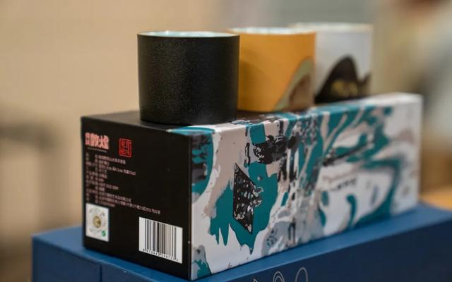 本品图案源自莫高窟唐代217窟壁画《佛顶尊胜陀罗尼经变·序》。茶杯吸纳壁画中的黑、白、土黄三色作为杯身颜色,显现不同意境,图案以山峦为主,再现壁画叠染技艺。此款文创也是本次大展和东航赏味推出的联名文创产品