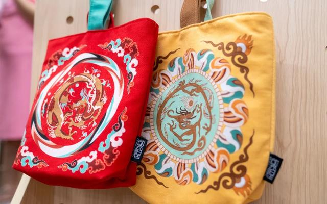 团龙藻井绒布包,手拎祥龙,轻松出行。壁画中的团龙穿越历史云烟,跃然于你的包面之间,彰显独特个人魅力,并预示着一段龙瑞好运的到来。