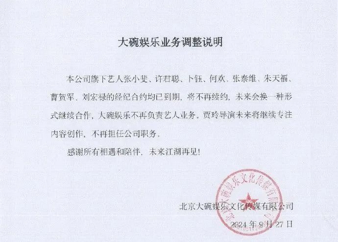 本公司旗下艺人张小斐、许君聪、卜钰、何欢、张泰维、朱天福、曹贺军、刘宏禄的经纪合约均已到期,将不再续约,未来会换一种形式继续合作,大碗娱乐不再负责艺人业务。贾玲导演未来将继续专注内容创作,不再担任公司职务。
