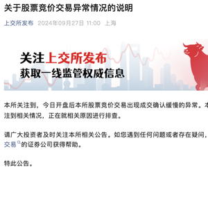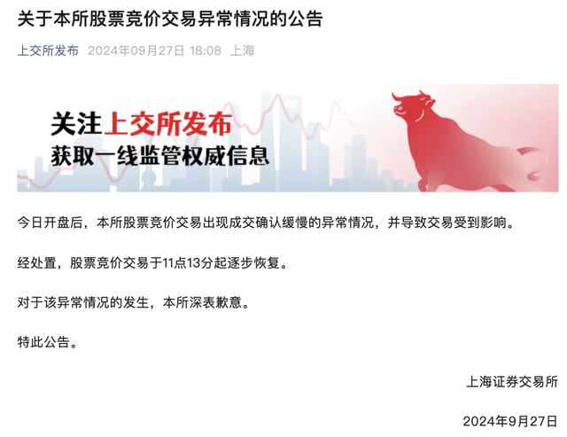 刚刚,上海证券交易所发布《关于本所股票竞价交易异常情况的公告》。上交所表示:“今日开盘后,本所股票竞价交易出现成交确认缓慢的异常情况,并导致交易受到影响。经处置,股票竞价交易于11点13分起逐步恢复。对于该异常情况的发生,本所深表歉意。”