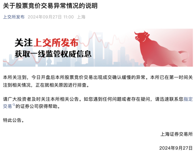上午11时整,上交所发布关于《关于股票竞价交易异常情况的说明》:“本所关注到,今日开盘后本所股票竞价交易出现成交确认缓慢的异常。本所已在第一时间关注到相关情况,正在就相关原因进行排查。”