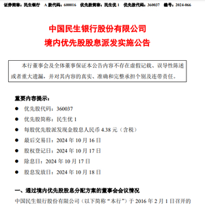 9月27日金融一线消息,民生银行今日发布境内优先股股息派发实施公告。公告显示,本次境内优先股(优先股代码:360037;优先股简称:民生优1)股息分配方案已经本行2024年8月29日召开的第九届董事会第三次会议审议通过。按照境内优先股票面股息率4.38%计算,每股优先股派发现金股息人民币4.38元(含税)。以境内优先股发行量2亿股为基数,本行本次派发现金股息共计人民币8.76亿元(含税)。股息发放日为2024年10月18日。
