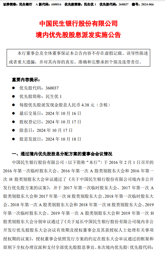 民生银行:每股优先股派发现金股息4.38元(含税)