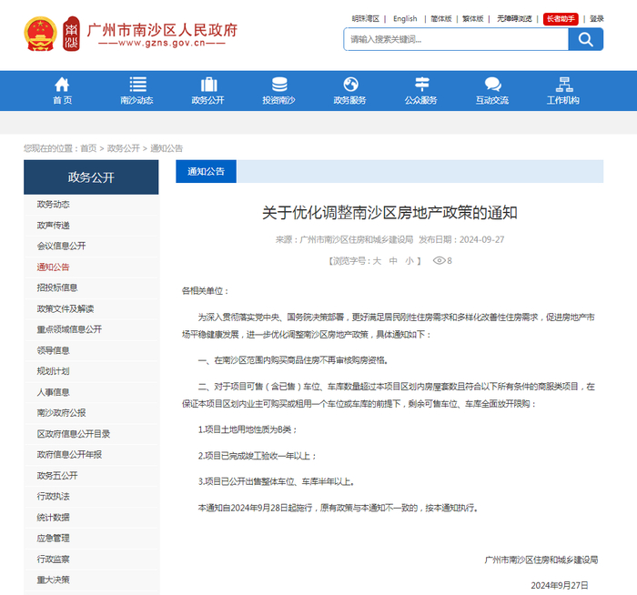 9月27日,广州南沙区发布《关于优化调整南沙区房地产政策的通知》,在南沙区范围内购买商品住房不再审核购房资格。
