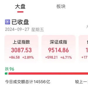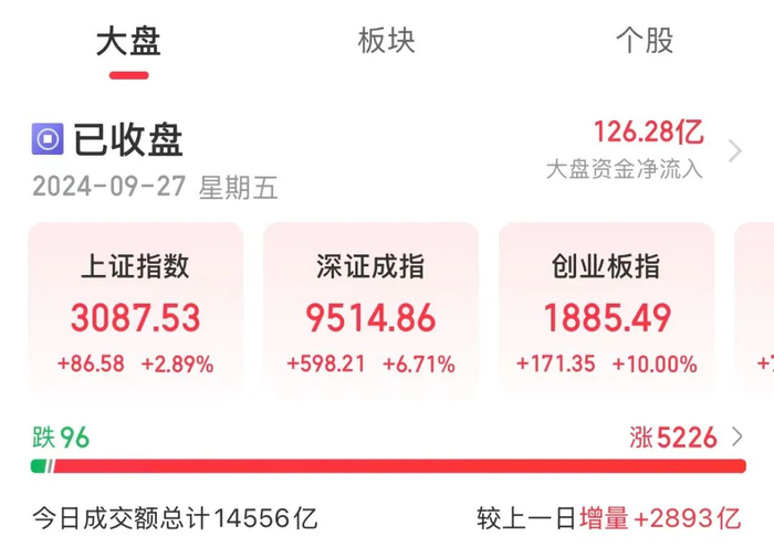 北京时间9月27日,A股继续大涨,上交所股票交易系统一度崩溃,截止至收盘时,上证指数大涨2.89%、深证成指大涨6.71%、创业板指大涨10%(不算是涨停板哈,毕竟创业板股票可以涨20%)。