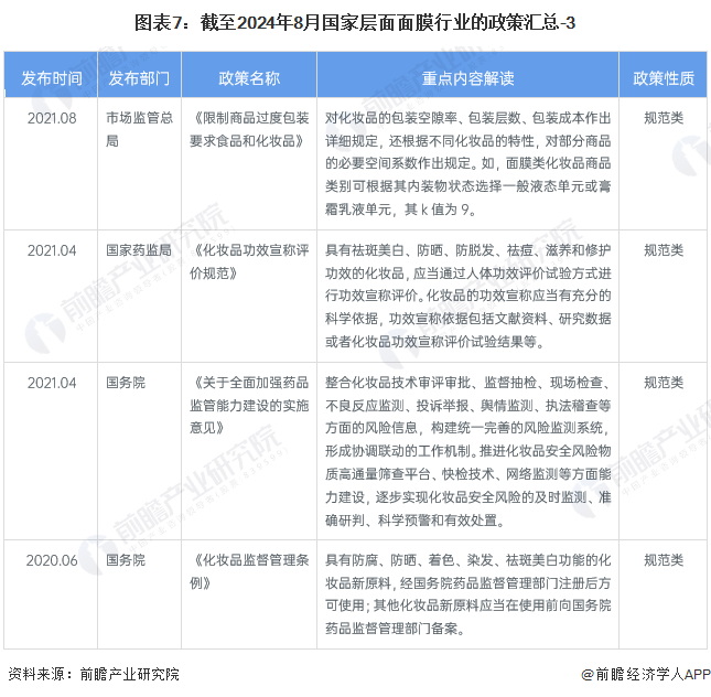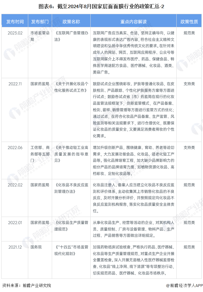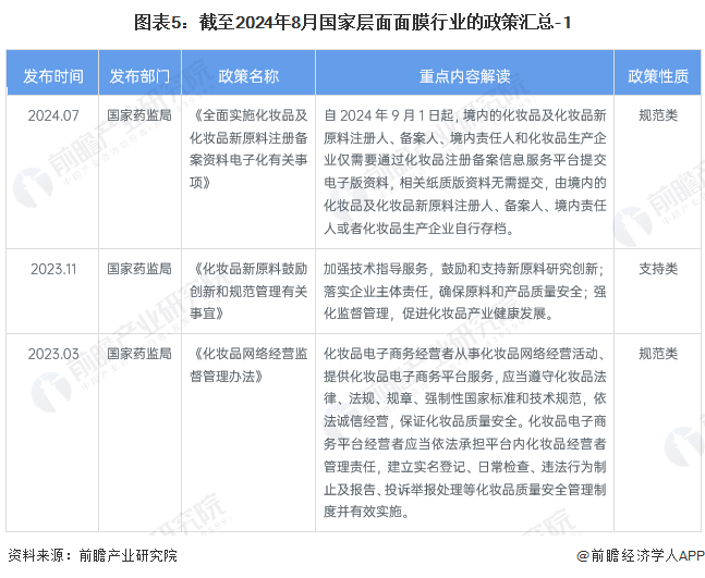 面膜行业作为化妆品领域的重要组成部分,从政策发展来看,经历了从"十二五"到"十四五"时期政策的持续优化和发展。"十二五"期间,面膜行业注重产业结构和企业结构的优化,推动企业规模化和自主创新能力的提升。进入"十三五",国家通过修订《化妆品卫生监督管理条例》等措施,加强了对化妆品包括面膜的规范管理,确保了产品的安全性和合规性。而在"十四五"时期,化妆品行业继续得到政策的支持,鼓励行业进行高端制造研发,强化品牌建设,丰富产品品类,以科技提升市场竞争力,满足消费者对高品质产品的需求,推动行业向更高质量、更可持续的方向发展。以下是与面膜行业相关的重点政策汇总: