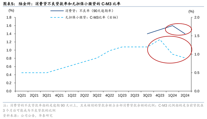 陆金所的小微贷质量也有提升。陆金所主营小微贷,此前由于小微企业的经营状况和现金流面临一定压力,陆金所的小微贷质量从2021年就持续承压,同时陆金所也开始着手清理高风险贷款,以应对风险,最终小微贷质量在4Q23触底。C-M3比率是陆金所小微贷的前瞻风险指标,描述当前贷款在3个月后可能成为不良贷款的比例,为了更贴合本文信用贷款的讨论主体,我们选取无担保小微贷的C-M3比率作为观测指标,这个指标在4Q23触顶达到1.4%,后降低至2Q24的0.9%。