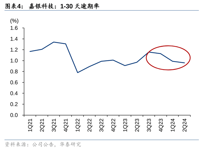 嘉银科技的规模较小(2Q24放款量240亿元),并且业务模式是不承担风险的轻资本业务,其贷款质量也有好转。1-30天逾期率由1Q23的0.91%涨至3Q23的1.16%后触顶,随后又降至2Q24的0.96%。