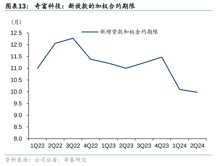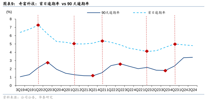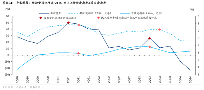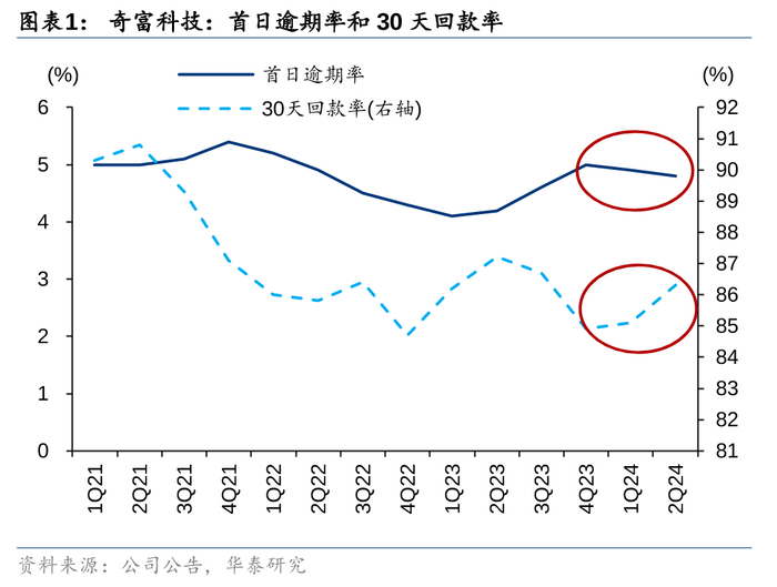 1) 奇富科技的贷款质量在4Q23触底。首日逾期率由1Q23的4.1%涨至4Q23的5.0%,后降至2Q24的4.8%,30天回款率由1Q23的86.2%降至4Q23的84.9%,后又提升至2Q24的86.3%;