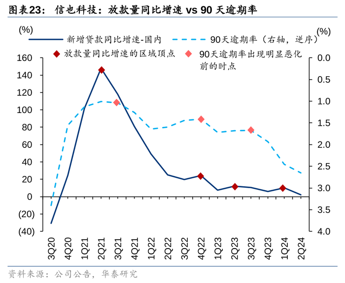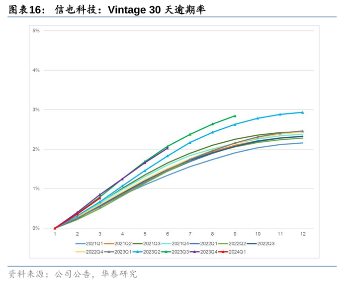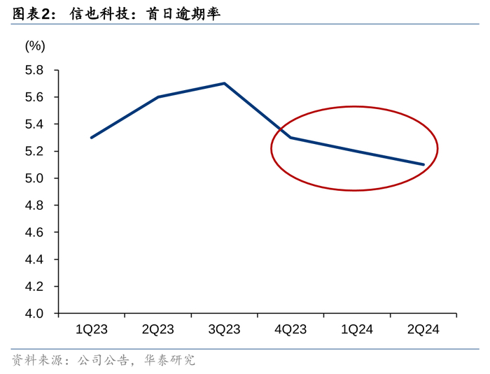 2) 信也科技贷款质量的触底时间是3Q23。首日逾期率由1Q23的5.3%涨至3Q23的5.7%,后降至2Q24的5.1%;