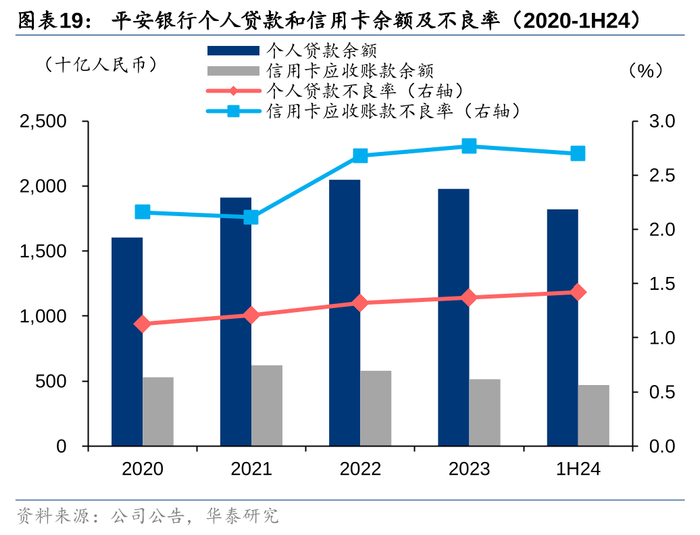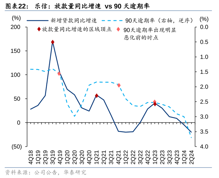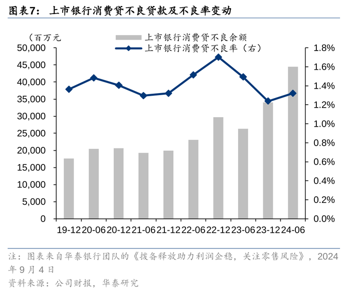 相比之下,2024年来传统金融机构的零售贷款质量仍然有压力,华泰银行团队的数据显示(《拨备释放助力利润企稳,关注零售风险》,2024年9月4日),1H24上市银行的零售贷款不良率(近似60天逾期率)较2023年末提升11bps至1.01%,其中上市银行消费贷和信用卡不良率较23年末分别+8bp和+12bp至1.32%和2.26%。