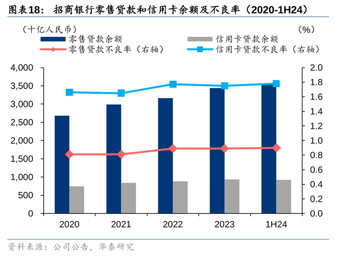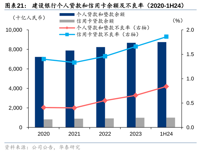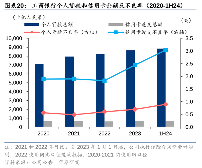 从贷款质量看,出现不同程度恶化。不论是整体零售贷款,还是信用卡贷款,不良率均呈现上升趋势。对于零售贷款,2020-1H24招商、平安、工商、建设银行的不良率分别上升0.09/0.29/0.34/0.43pcts,其中建设银行贷款质量恶化较严重。对于信用卡贷款,2020-1H24招商、平安、工商、建设银行的不良率分别上升0.12/0.54/1.14/0.46pcts,其中工商银行恶化较严重。