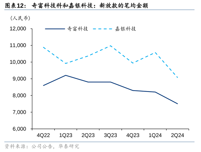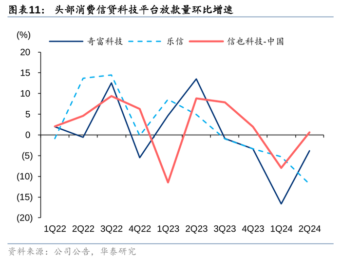 放款量的环比下滑不是季节性因素。一般来说,一季度和四季度的放款量会受假期影响而波动,而3Q23-2Q24各平台的放款量出现连续下滑或环比增速放缓,且1H24的放款量相比2H23也是降低的,因此我们认为这几个季度以来的放款量下滑并非由于季节因素。