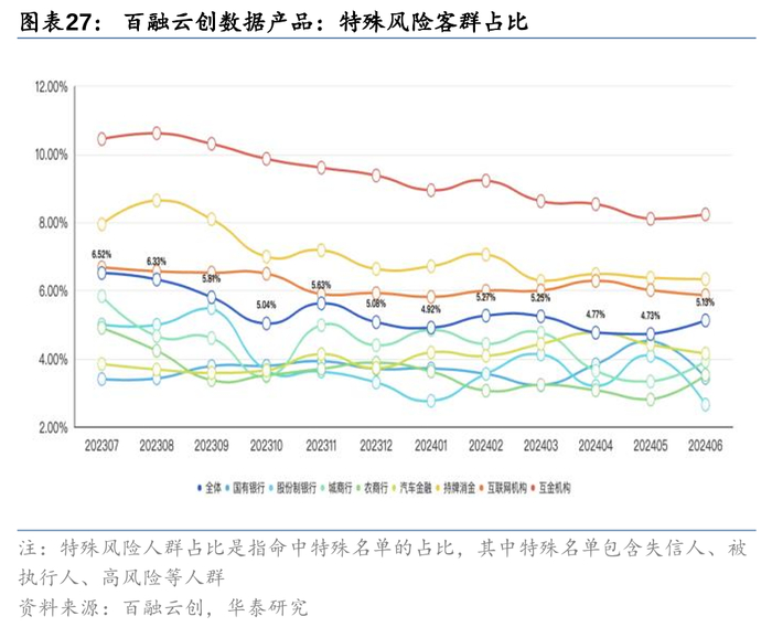 互金平台的贷前潜在客群质量相对稳定。下面三张图呈现了百融云的信贷风险数据,评估了各种类型机构的贷前潜在客群的质量。从百融云最核心的信用评分数据看,互金平台贷前潜在客群的信用评分走势相对平稳,从图上看大致稳定在600左右。从优质客群占比看,互金平台始终维持在略高于4%的水平,2024年3月后的优质客群占比还略有提升。从特殊风险客群占比看,过去一年互金平台特殊风险客群(失信人、被执行人、高风险等人群)的占比连续下降,由10.5%左右降至8%左右。