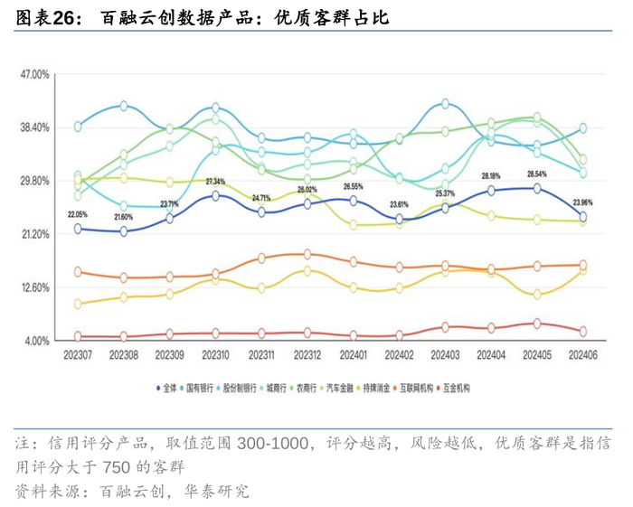 银行的贷前潜在客群质量波动较大。首先,银行的贷前潜在客群的信用评分波动大于互金平台,股份制银行的信用评分在670到700左右波动。其次,银行的优质客群占比波动大于互金平台,再以股份制银行为例,优质客群占比高时接近38%,低时可能仅有25%左右。最后,银行特殊风险客群占比的波动亦大于互金平台,同样以股份制银行为例,其特殊风险客群占比大致在3-5.5%之间上下波动。