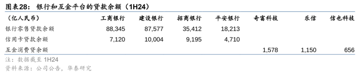 互金平台的体量更小,产品更灵活,这使得互金平台即使在面对潜在客群质量波动时也有天然优势,能够迅速收紧放款策略,并且即便引入了潜在风险,处理起来难度也更小。1H24上市互金平台的贷款余额在600亿-1,600亿之间,而上市银行的零售贷款余额在万亿甚至接近10万亿的级别,信用卡的贷款余额也是接近万亿的体量。另外风险偏好的差异也导致了产品的差异,因为银行主要面向信用资质相对较好的客群,我们认为总体来说银行消费贷的笔均金额应大于互金平台的消费贷,合约贷款期限也应更长。银行消费贷的贷款金额上限达到100万元甚至更高,2023年信用卡卡均授信额度约3万元,贷款期限最长能达到3-5年,而互金平台的单笔上限是20万,平均金额在千元到1万元左右,贷款期限通常在1年以内。