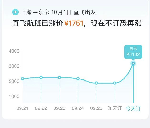 如10月1日上海直飞东京,最低直飞裸票价为3182元,耗时2小时50分钟,价格走势显示,已经涨价1751元。