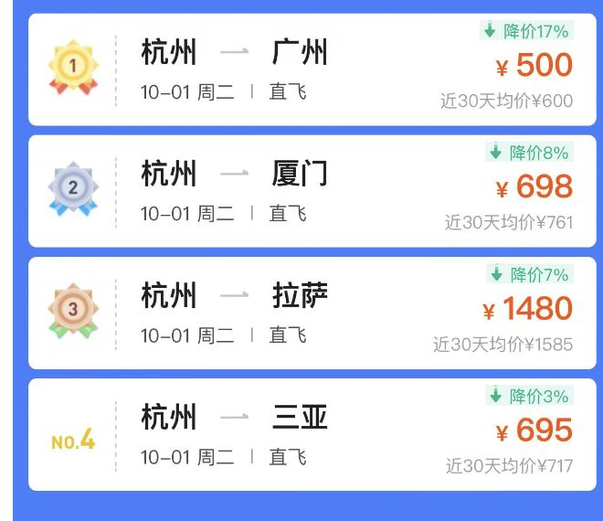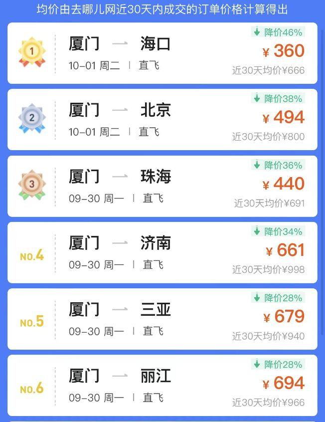 不仅如此,记者查询发现,不少热门城市国庆假期去程机票,都有不同程度的跳水。9月30日从上海出发到深圳、青岛等城市均有不同程度的价格跳水。