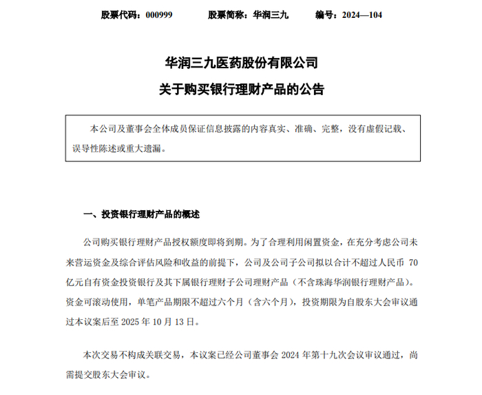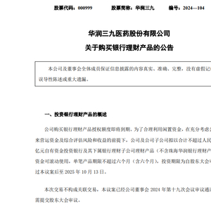 9月27日晚间,华润三九发布关于购买银行理财产品的公告。