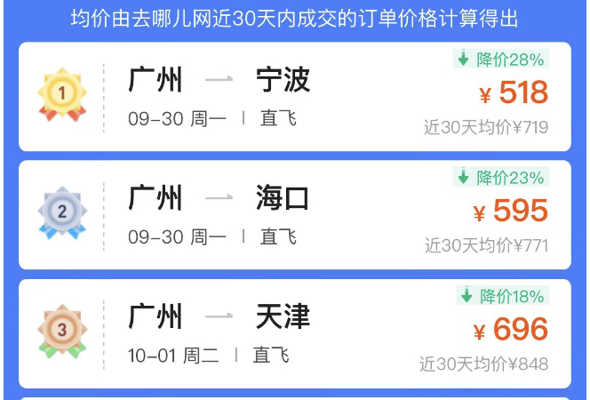 不仅如此,记者查询发现,不少热门城市国庆假期去程机票,都有不同程度的价格跳水,比如9月30日从上海出发到深圳、青岛等城市的机票。