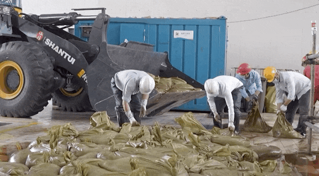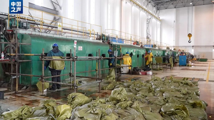 这几天,电厂清理海蜇的人员三班倒,每天都有少则四五百袋,多则上千袋海蜇被清理出厂。最严重的时候,一上午打包好的海蜇袋就铺满了机房的地面,不得不开来铲车运走。