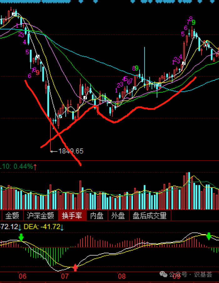 从此以后市场开始一轮震荡下行的指数行情。从2009年7月份到2013年6月份1849点。在这个震荡期间具有多次V型走势。