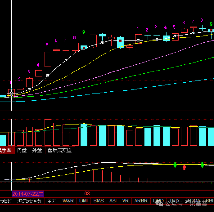 启动时间:2014年7月12日启动,指数连续发动了8天上涨的走势,而后大阴线分歧,次日反包,反包后,市场步入震荡走势。