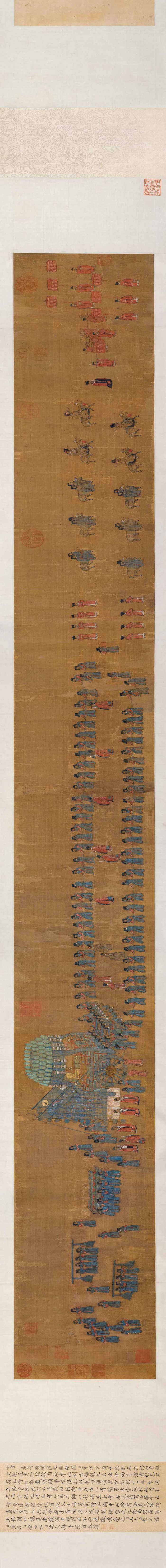 《卤簿玉辂图》以工笔重彩描绘了宋代皇帝出行祭祀的卤簿仪仗。此图出自南宋宫廷画师的手笔,描绘了玉辂、开道骑兵、导驾官员、侍从等,共计一百八十一人。