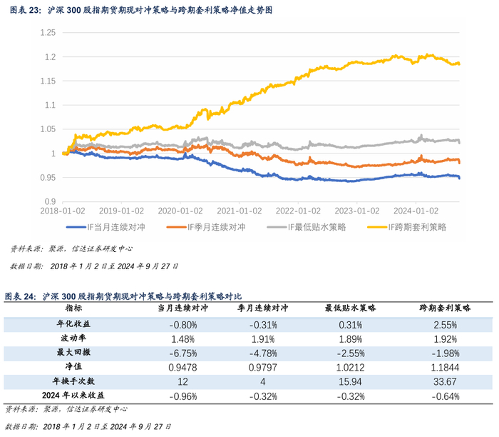 2018年1月2日至2024年9月27日,基于沪深300股指期货的期现对冲策略与跨期套利策略回测结果如下图所示。