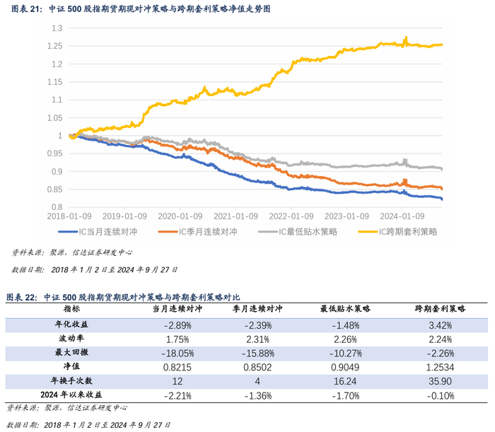 2018年1月2日至2024年9月27日,基于中证500股指期货的期现对冲策略与跨期套利策略回测结果如下图所示