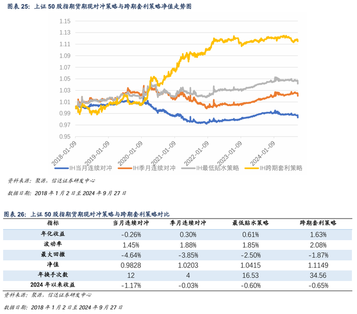 本周IH各合约转为升水,对冲策略周内出现回撤。截至2024年9月27日,最低贴水策略选择IH2410合约。