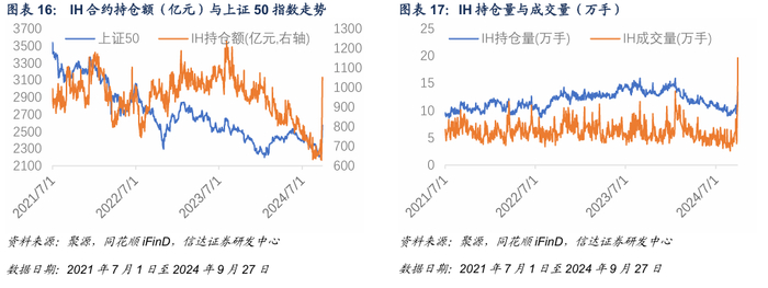 2024年9月27日,IH合约持仓额为1050.84亿元,持仓量13.33万手,成交量19.61万手。本周IH持仓量成交水平大幅提升。