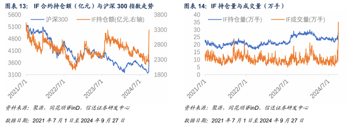2024年9月27日,IF合约持仓额为3288.7亿元,持仓量28.96万手,成交量34.98万手。本周IF持仓量成交水平大幅提升。