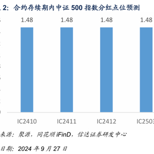 2024年9月27日,我们对股指期货标的指数未来一年内分红点位进行预测,预估中证500、沪深300、上证50、中证1000指数分红点位分别为90.09、88.54、74.44、67.66。