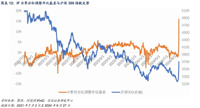 本周IF当季合约分红调整年化基差上行,周内低点贴水1.48%,当前基差升水15.94%,相对前一周基差上行,处于历史高点。