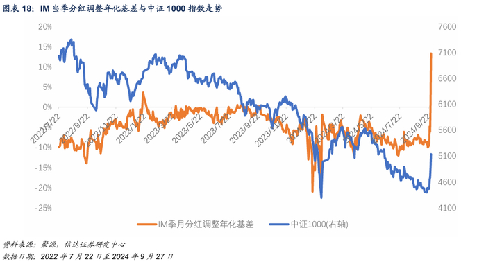 本周IM当季合约分红调整年化基差相对周一上行,周内低点贴水9.40%,当前基差升水13.35%,相对前一周基差上行,高于2022年初以来中位数,处于历史高点。