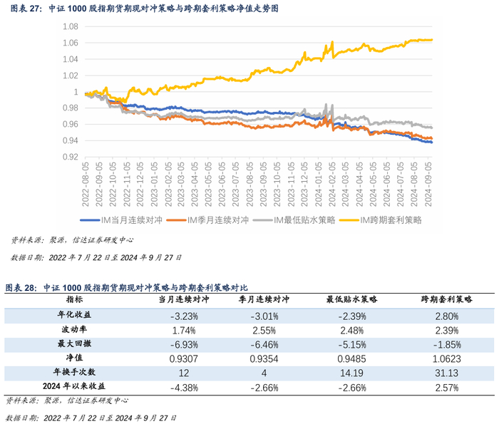 本周IF各合约基差升水,对冲策略在周内出现回撤。截至2024年9月27日,最低贴水策略选择IF2410合约。