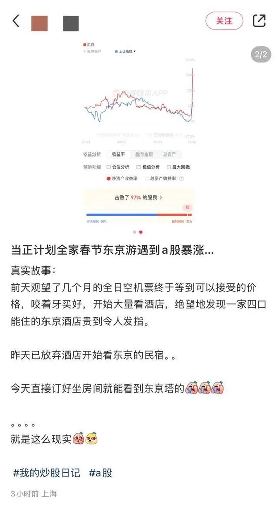 还有网友直言,计划了全家东京旅游,本打算放弃价格贵到“令人发指”的酒店转订民宿,A股大涨后“直接订好坐房间就能看到东京塔”的住宿。