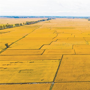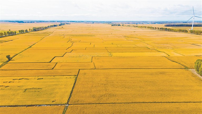 桦川县玉成现代农机专业合作社水稻地块犹如一片金色的海洋。