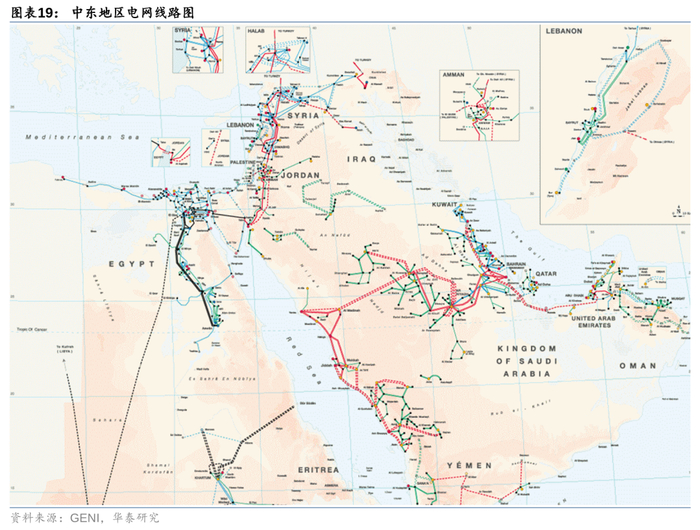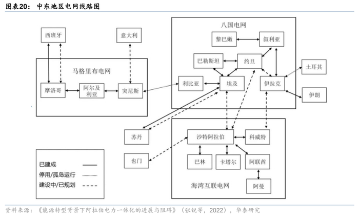 中东分为三个次区域电网,互联互通水平较低。阿拉伯地区现存三个相互独立的次区域电网。1)马格里布电网连接北非三国,采用欧洲ENTSO-E的技术标准,与欧洲国家存在互联线路;2)八国电网由埃及、伊拉克、约旦、叙利亚和土耳其于1988年发起创立,后扩大到利比亚、黎巴嫩和巴勒斯坦,1996年八国就区域电力贸易达成了基本的操作规范;3)海湾互联电网连接海合会六个成员国,其一体化水平在区域内最高——2001年六国成立海合会互联互通管理局,专门负责区域电力一体化,2009年六国实现全面的电网互联,设置互联控制中心,并达成《区域电网总协定》、《电力交易协定》,2018年启动建设海合会电力市场系统,探索建设电力实时交易市场。总体而言,海湾互联电网互联程度相对较高,但马格里布电网与八国电网的电力互联主要用于双边临时性的、一次性的电力互助,互联程度很低。