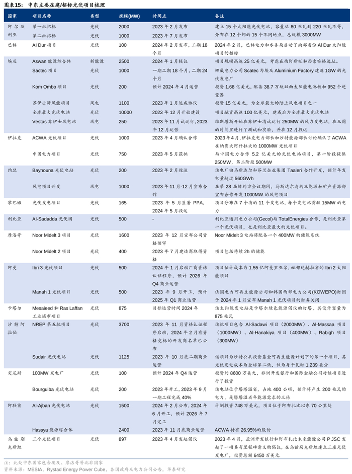招标及在建规模庞大,未来装机有望高增。我们对中东地区的近期规划及在建项目进行了统计,项目合计规模高达35.56GW。其中沙特国家可再生能源计划National Renewable Energy Program(NREP)前四轮光伏项目规模达4.5 GW,沙特于24年2月公布了NREP第5轮3.7 GW太阳能项目的资格厂商名单,埃及10GW全球最大光伏电站已于2023年12月开始建设,项目融资高达100亿美元。风光建设如火如荼,大规模的规划及在建项目或将有力支撑未来储能装机。