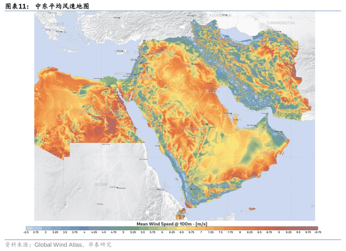 中东地区在风力发电领域具有显著的地理和政策优势。与世界其他地区相比,中东许多地区风速较高,例如埃及的苏伊士湾、摩洛哥的大西洋沿岸、沙特阿拉伯的西北部沙漠以及阿曼的南部地区。沙特年均风速 6-8m/s,埃及许多地区风速均在8m/s以上,阿曼某些近海区域平均风速接近10m/s,资源优势尽显。此外与美国和欧洲相比,中东的风力发电项目审批流程更为高效,较少受到社区反对的阻碍,这为风电发展奠定了良好的流程环境。