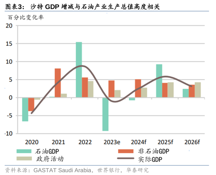 中东能源需求和经济发展高度依赖化石燃料。根据Ember统计,中东地区用电量稳步增长,2019-2023年发电量复合增长率达2.5%,根据IEA及Rystad Energy,2024-2026年中东电力需求增长率将达3%,2050年需求达2000TWh。由于化石能源供应充足且价格便宜,能源结构中以化石能源为主,清洁能源发展仍处于起步阶段,2023年清洁能源的发电量占比仅为5.0%。高度依赖化石能源的结果是碳排放远高于全球平均水平。根据Ember统计,2023年中东地区平均度电碳排放为658克/kWh,远超全球480g/kWh的水平。同时,由于中东各国均为石油天然气强国,经济结构也偏单一,经济情况受到油价影响大。以沙特为例,根据GASTAT Saudi Arabia和世界银行的统计,沙特石油产业发展与沙特全国GDP增速、政府财政情况均高度相关。