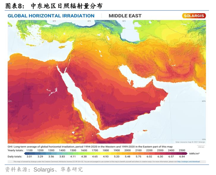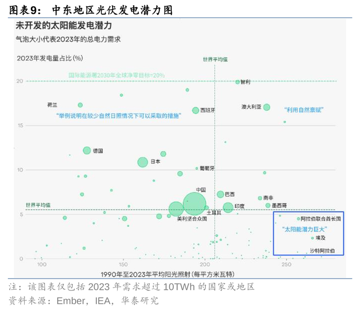 中东太阳能资源优渥,成本优势显著。中东地区年均太阳辐射量普遍超过2000kWh/m2,整个中东地区接收的太阳能占地球太阳能资源的22%-26%。根据国际可再生能源署,由于项目规模大、劳动力成本低、日照资源丰富等,中东地区的光伏发电成本是全球平均水平的五分之一。以阿联酋、埃及、沙特为代表的中东国家坐落在发电潜力图的右下角,其平均阳光照射强度远高于其他国家,而光伏发电量占比不足5%,未来发展潜力较大。