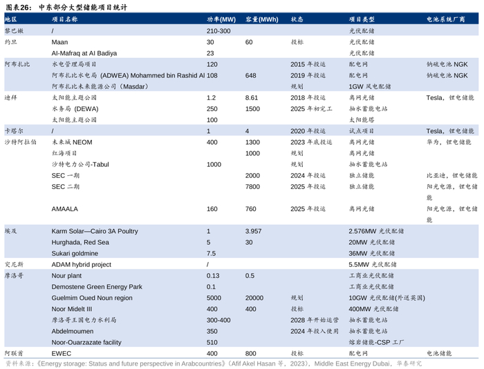 1) 沙特、阿联酋是目前风光可再生能源推进比较积极的国家,在日内调节的短时储能项目上偏好电化学储能,且背靠强大的国家主权基金/经济实力,执行落地性强,因此目前主要考虑这两个国家。