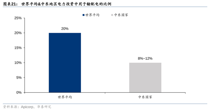 电网投资力度偏弱,储能需求愈发迫切。中东地区电网基建偏弱,且电力投资呈现“重电源轻电网”特点。根据Apicorp统计,中东国家的可再生能源电力投资结构中,绝大部分用于投资发电,而仅有8%~12%用于输配电,远低于全球20%的平均水平,不平衡的投资结构限制了电网的升级改造。此外,中东电力市场高度国有化也限制了私营部门及外部的投资。在电网基建薄弱的情形下,储能的需求变得愈发迫切。