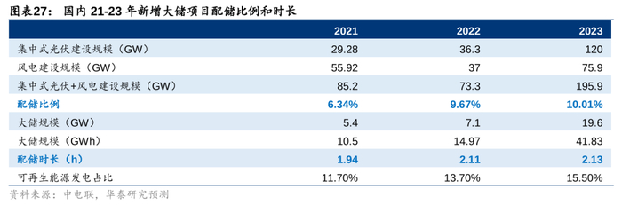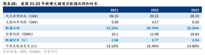 中美的配储比例呈上升趋势,配储时长趋势不一。作为参考,我们统计了21-23年中美两国的装机数据,随着可再生能源比例的提高,中美两国的配储比例均呈现提升的趋势,中国配储时长走势向上,主要系各地政策对高配储时长的项目更为偏好,而美国配储时长从20年的1.94h提升至21年的2.98h后,22-23年呈下降趋势,主要系调频储能占比提升。