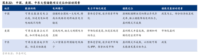中东大储仍处发展初期,偏提前部署,未来发展潜力大。我们以能源结构、电网情况、电力市场化程度来对比中国、美国、中东的储能需求定位和驱动因素。