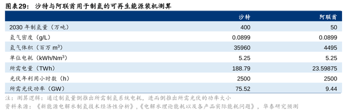 3) 储能远期需求应该是要综合考虑用电量、可再生能源发电比例、灵活性资源情况、电网消纳能力等来假设。其中,在灵活性资源方面,需要注意沙特和阿联酋均积极发展氢能(用可再生能源发电来电解水制绿氢),而氢能是长时储能的重要形式。因此我们在考虑锂电池储能的远期空间时,扣除用于制氢的风光装机量。我们假设可再生能源制氢均为光伏制氢,电解槽单位电耗为5.25 kWh/Nm3,沙特阿联酋的光伏有效年利用小时数均为2500h,我们测算出沙特/阿联酋制氢所需光伏装机达75.52GW/9.44GW。