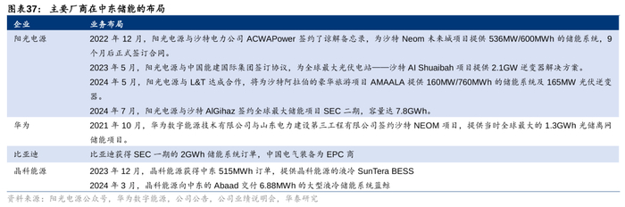 中国储能厂商已大举布局中东,阳光电源龙头地位显著。阳光电源从22年开始便在中东有多个大项目进行落地,相继与ACWA、L&T等巨头达成合作,24年7月与沙特AlGihaz签约全球最大7.8GWh储能项目,凸显阿尔法属性。此外,华为早在21年部署了1.3GWh的沙特NEOM离网项目,比亚迪也曾中标SEC一期2GWh订单,中国企业大举布局中东,先发优势显著。